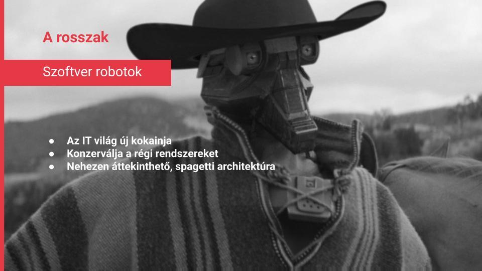 A szoftverrobotok trendjét sem fogadhatjuk nagy lelkesedéssel. Ezek az eszközök egymással inkompatibilis rendszerek között végeznek emberi munkát helyettesítő adatmásolást (gyakorlatilag az egyik képernyőről a másikra írnak át adatokat), így gyors, felszínes megoldást nyújtanak a rendszerintegrációra – de ha rájuk hagyatkozunk, akkor bennragadunk a régről örökölt biztosítói IT rendszerekben, és nem fogunk jövőbe mutató IT-t építeni. „A szoftverrobot az IT világ kokainja”, fogalmazott Székely Sándor.